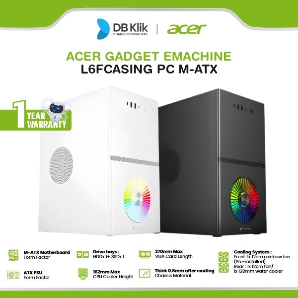 Membeli berarti setujuMohon untuk membaca deskripsi barang terlebih dahuluSetelah barang diterima wajib di video unboxing. Apabila tidak ada video unboxing, maka kami tidak akan menerima komplain dalam bentuk apapunUntuk setiap pembelian unit pecah belah wajib menambahkan bubble + triplek dan asuransiApabila tidak menambahkan bubble + triplek dan asuransi maka segala kerusakan dan kehilangan bukan tanggung jawab kamiAcer Gadget Emachine L6F Casing PC M-ATX Pre-Installed 1 Fan RGB - Black / WhiteSpecificationsM/B Form Factor : M-ATXPSU Form Factor : ATXTYPE C (USB3.0)+ USB3.0+ USB1.1+ HD AudioDrive bays : HDDx 1+ SSDx 1Cooling System :Front :1x 12cm rainbow fan (Pre-installed)Rear : 1x 12cm fan/ 1x 120mm water coolerMaterial of Chassis : T=0.6mm after coatingGPU Clearance : 270mmCPU Clearance : 162mmProduct Size : L280x W188x H350mmPacking Size : L400x W236x H345mm1 Year WarrantyNote : Selama produk tayang = ready stokPastikan alamat pengiriman telah benar, kesalahan alamat bukan tanggung jawab kami Untuk pertanyaan maupun keluhan bisa langsung chat admin kami