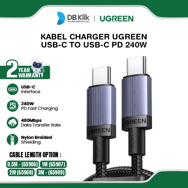 DeskripsiMerek : UGREEN Cable C to C 240WModel : 65906 (0.5M) / 65907 (1M) / 65908 (2M) / 65909 (3M)Material : Nylon Braided + Aluminium MetalCurrent : 5A /240WPanjang : 0.5M -2MTransmission rate : 480MbpsChipset : E-MarkerSupport : Charging & Data Transmission SYNC