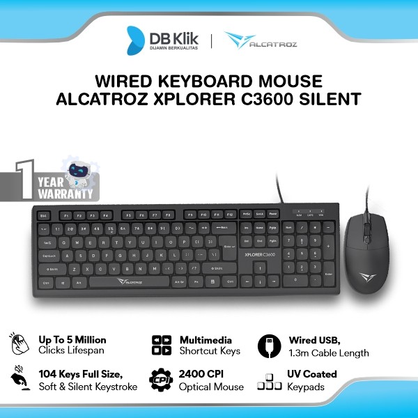 Alcatroz Xplorer C3600 Wired Keyboard & Mouse Combo adalah keyboard dan mouse combo Silent terbaru dari brand Alcatroz, keyboard dan mouse kabel dengan desain yang ergonomis memberikan pengalaman mengetik yang unik dan berbeda dengan keyboard lain, total 104 keypad yang lembut dan silent key, CPI mouse 2400 CPI yang responsif sehingga nyaman digunakan. SIlent keyboard mouse dan combo cocok digunakan untuk bekerja di Rumah/Office.