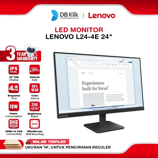 Brand Type : Lenovo L24-4ePanel Size(Inch) : 24 InchPanel Type : IPS FlatPanel Resolution : 1920 x 1080 (Full HD)Aspect Ratio : 16:9 Wide