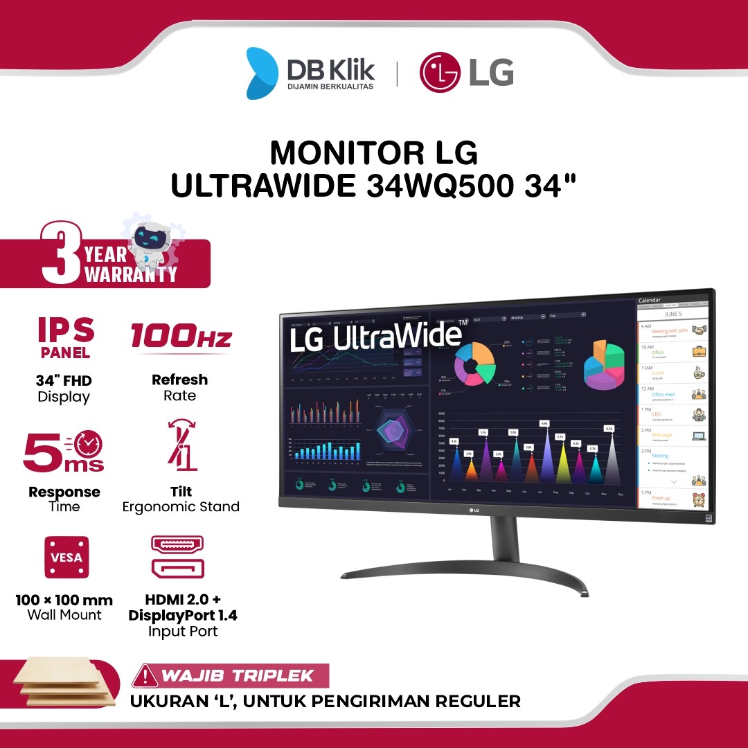 Brand Type : LG 34WQ500-BPanel Size(Inch) : 34 InchPanel Type : IPS FlatPanel Resolution : 2560 x 1080 (FHD)Aspect Ratio : 21:9 UltraWide