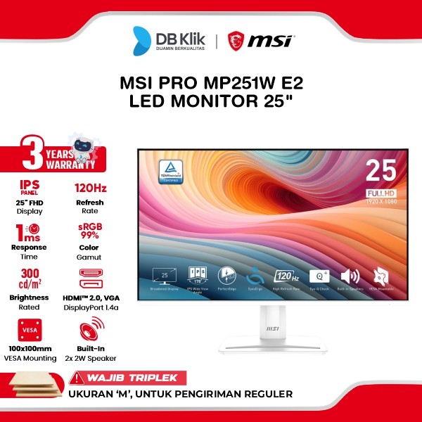MSI PRO MP251W E2 LED Monitor 25" IPS FHD 120Hz 1ms Adaptive Sync HDR Built In Speaker HDMI VGA DP