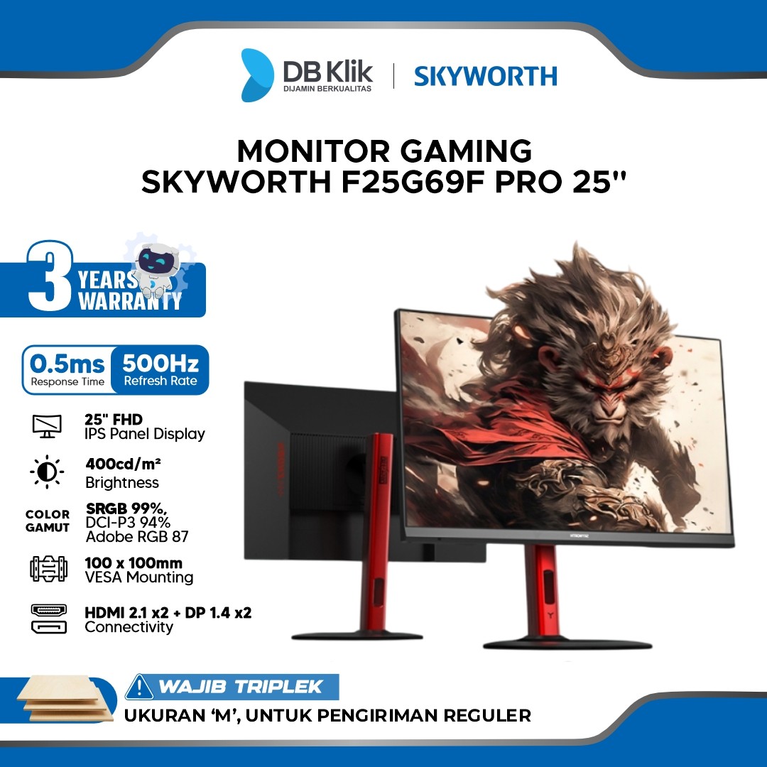 Membeli berarti setujuMohon untuk membaca deskripsi barang terlebih dahuluSetelah barang diterima wajib di video unboxing. Apabila tidak ada video unboxing, maka kami tidak akan menerima komplain dalam bentuk apapunUntuk setiap pembelian unit pecah belah wajib menambahkan bubble + triplek dan asuransiApabila tidak menambahkan bubble + triplek dan asuransi maka segala kerusakan dan kehilangan bukan tanggung jawab kamiSKYWORTH F25G69F PRO Monitor Gaming 25" IPS FHD 500Hz 0.5ms AMD FreeSync HDR400 Full Ergonomic Stand HDMI DPBrand Type : Skyworth F25G69F ProPanel Size(Inch) : 25Panel Type : IPS FlatPanel Resolution : 1920 x 1080 (Full HD)Aspect Ratio : 16:9 WideBrightness (cd) : 400Refresh Rate(hz) : 500Response Time (ms) : 0.5Sync : AMD FreeSyncConnectivity : HDMI 2.1 x2 + DP 1.4 x2Speaker : NoAudio port : 1 x 3.5mm Audio OutVESA mounting (mm) : 100 x 100Ergonomic Stand : Yes (HAS, Tilt, Swivel, Pivot)Panel bit : 8 bitsHDR : HDR400NTSC : -SRGB : 99Adobe RGB : 87DCI-P3 : 94Power Cons (watt) : 36Product Weight (nw/kg) : 4.4Box Dimensions (cm) : 63 x 47 x 17.5Volume Weight (kg) : 9Include :Adapter + Power CableDP Cable3 Years WarrantyNote : Selama produk tayang = ready stokPastikan alamat pengiriman telah benar, kesalahan alamat bukan tanggung jawab kami Untuk pertanyaan maupun keluhan bisa langsung chat admin kami