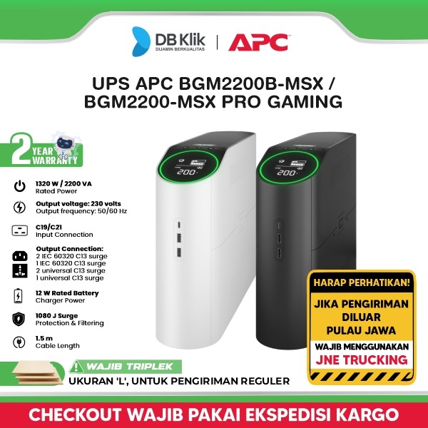 Ups APC BGM2200B-MSX / BGM2200-MSX Pro Gaming Sinewave 2200VA 1320W Pure Sine WaveBGM2200B-MSX = BlackBGM2200-MSX = WhiteMainMain Input Voltage : 230 V AC 1 phaseOther Input Voltage : 230 VMain Output Voltage : 230 V 1 phaseRated power in W : 1320 WRated power in VA : 2200 VAproduct or component type : Uninterruptible power supply (UPS)Input Connection Type : C19/C21output connection type :2 IEC 60320 C131 IEC 60320 C13 surge2 universal1 universal surgeCable length : 1.52 mNumber of cables : 1Battery type : Lead-acid batteryBatteries & RuntimeNumber of battery filled slots : 1Number of battery free slots : 0Battery recharge time : 16 hNumber of battery replacement quantity : 1Battery voltage : 24 VOvercurrent protection : 15 ABattery charger power : 12 W ratedBattery life : 3…5 year(s)GeneralProvided equipment : USB cablesafety guide:2, power cable1, power adapterproduct web sub-family : Gaming performanceNumber preinstalled power module : 0Number of power module free slots : 0Redundant : NoPhysicalColour : Black and WhiteHeight : 292.10 mmWidth : 104.14 mmDepth : 408.94 mmnet weight : 12.24 kgMounting support : FloorMounting preference : No preferenceMounting mode : Not rack-mountableTwo post mountable : 0USB compatible : YesMounting position : VerticalInputNetwork frequency : 50/60 Hz +/- 3 Hzplug standard : C19/C21Input voltage limits : 168...302 VMaximum input current : 12 ASwitching current capacity : 15 AInput harmonic distortion : Less than 3 % for full loadInput protection type : Circuit breakerOutputMaximum configurable power in W : 1320 WOutput frequency : 50/60 Hz +/- 3 Hz sync to mainsUPS type : Line interactiveWave type : Sine waveFull load runtime : 00:30:00Half load runtime : 00:05:30Maximum configurable power in VA : 2200 VAPacking UnitsUnit Type of Package 1 : PCENumber of Units in Package 1 : 1Package 1 Height : 15.5 cmPackage 1 Width : 35.5 cmPackage 1 Length : 48 cmPackage 1 Weight : 14.82 kgContractual warrantyWarranty : 2 years repair or replace