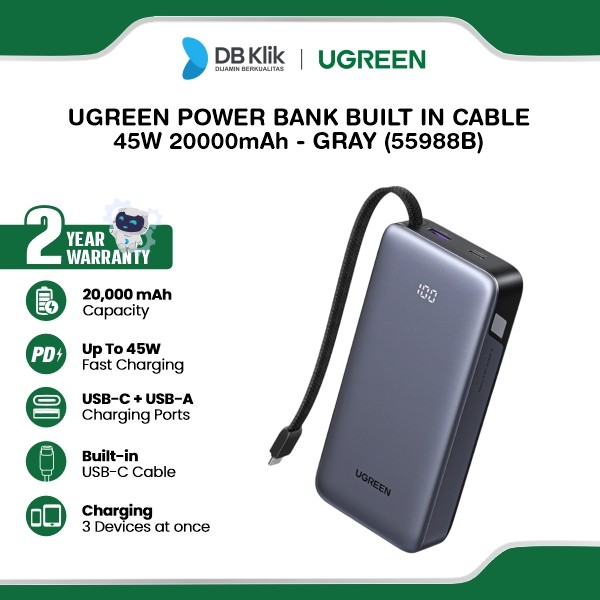 Mohon untuk membaca deskripsi barang terlebih dahuluSetelah barang diterima wajib di video unboxing. Apabila tidak ada video unboxing, maka kami tidak akan menerima komplain dalam bentuk apapunUntuk setiap pembelian unit pecah belah wajib menambahkan bubble + triplek dan asuransiApabila tidak menambahkan bubble + triplek dan asuransi maka segala kerusakan dan kehilangan bukan tanggung jawab kamiUGreen Power Bank Built in Cable 45W 20000 mAh - Gray (55988B)SpecificationsProduct Name : 45W Power Bank with Built-in CableUSB-C Input : 5V = 3A / 9 * V = 3A / 12 * V = 3A / 15 * V = 3AUSB-C Cable Input : 5V = 3A / 9 * V = 3A / 12 * V = 3A / 15 * V = 3AUSB-C Output : 5V = 3A / 9 * V = 3A / 12 * V = 3A / 15 * V = 3A / 2 * OV = 2.25AUSB-C Cable Output : 5V = 3A / 9 * V = 3A / 12 * V = 3A / 15 * V = 3A / 20 * V = 2.25AUSB-A Output : 10v = 2.25A / 5 * V = 3A / 9 * V = 2A / 12 * V = 1.5ATotal Output : 5V = 3AMaxTotal Cell Capacity : 20000mAhBattery Capacity : 10000mAh (Two Cells in Series)Rated Energy : 74Wh 7.4VRated Capacity : 13000mAh (TYP 5V 3A)Battery Type : Polymer Lithium-ion BatteryBattery Charging Limited Voltage : 4.2v2 Years WarrantyNote : Selama produk tayang = ready stokPastikan alamat pengiriman telah benar, kesalahan alamat bukan tanggung jawab kami Untuk pertanyaan maupun keluhan bisa langsung chat admin kami