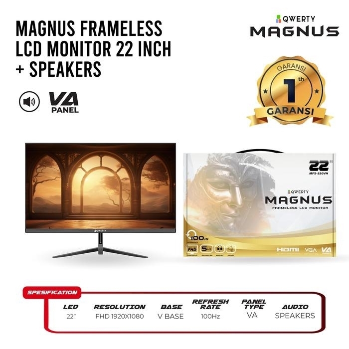 QWERTY MAGNUS LED Monitor 22" VA FHD 100Hz 5ms Built In Speaker HDMI VGASpecifications :LED : 22InchResolution : FHD 1920X1080Base : V BaseRefresh Rate : 100HzPanel Type : VAAudio : SpeakerInside Box :HDMI Cable x1