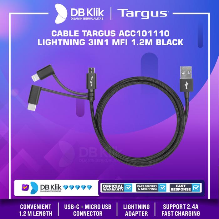 (MEMBELI BERARTI SETUJU) MOHON BACA DESKRIPSI BARANG TERLEBIH DAHULU UNTUK SEMUA BARANG YANG DI TERIMA WAJIB DI VIDEOKAN UNBOXINGNYA BILA TIDAK ADA VIDEO UNBOXING KAMI TIDAK MENERIMA KOMPLAIN DALAM BENTUK APAPUN Kabel Data Targus ACC101110 USB A to MicroUsb USB-C Lightning MFI 1.2M Overview One cable solution enable you to charge and sync Lightning connector devices as well as using Micro USB devices, it supports 2.4A fast charging. Connect to your laptop to charge and sync, use your own wall charger to charge from the wall, or plug into a car charger and charge on the road. It is available in black, silver and gold, so you'll be able to choose a cable that matches your iPhone, iPad and MacBook. FEATURES Charge & Sync an iPod, iPhone or iPad with the Lightning adapter; Charge & Sync devices like smartphones and tablets equipped with USB-C or micro USB connector Matching material & colors of the iPhone, iPad or MacBook, Premium aluminum Support 2.4A fast charging Weave cable: Durable and Resistant Convenient 1.2 m length Slim connector design, fits most protective cases MFi certified nb :*SELAMA PRODUK TAYANG = READY STOK *UNTUK BARANG PECAH BELAH DISARANKAN UNTUK MENGGUNAKAN TAMBAHAN BUBBLE WRAP / TRIPLEK *BUBBLE WRAP SUDAH TERSEDIA DI ETALASE KAMI. SILAHKAN TAMBAHKAN KE DALAM KERANJANG ANDA *PASTIKAN ALAMAT PENGIRIMAN TELAH BENAR. KESALAHAN ALAMAT BUKAN TANGGUNG JAWAB KAMI *Untuk PERTANYAAN & KELUHAN bisa langsung CHAT ADMIN KAMI *HAPPY SHOPPING