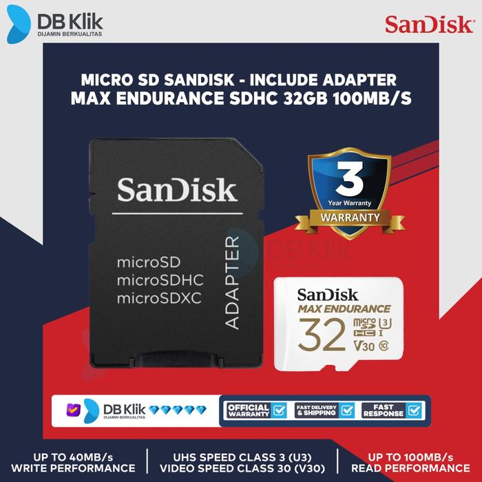 Membeli berarti setuju Mohon untuk membaca deskripsi barang terlebih dahulu. Setelah barang diterima Wajib di video unboxing Apabila tidak ada video unboxing, kami Tidak menerima komplain dalam bentuk apapun Micro SD SanDisk MAX ENDURANCE SDHC 32GB 100MB/s (SDSQQVR-032G-GN6IA) Spesifikasi : Kapasitas : 32GB Compability : microSDHC Speed : Up To 100MB/s Read Garansi : 3 Tahun SD Adapter : Yes nb : * Selama produk tayang = Ready stok * Barang yang sudah di beli tidak bisa dikembalikan * Pastikan alamat pengiriman telah benar. kesalahan alamat bukan tanggung jawab kami * Untuk pertanyaan & keluhan bisa langsung chat admin kami Terima kasih. Happy shopping