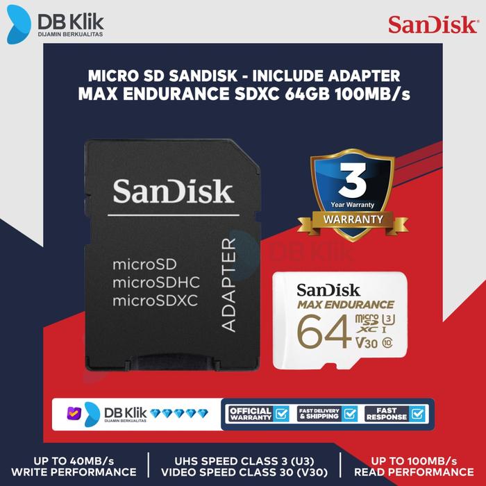 Membeli berarti setuju Mohon untuk membaca deskripsi barang terlebih dahulu. Setelah barang diterima Wajib di video unboxing Apabila tidak ada video unboxing, kami Tidak menerima komplain dalam bentuk apapun Micro SD SanDisk MAX ENDURANCE SDXC 64GB 100MB/s (SDSQQVR-064G-GN6IA) Spesifikasi : Kapasitas : 64GB Compability : microSDXC and microSDHC Speed : Up to 100MB/s Read Garansi : 5 Tahun SD Adapter : Yes nb : * Selama produk tayang = Ready stok * Barang yang sudah di beli tidak bisa dikembalikan * Pastikan alamat pengiriman telah benar. kesalahan alamat bukan tanggung jawab kami * Untuk pertanyaan & keluhan bisa langsung chat admin kami Terima kasih. Happy shopping