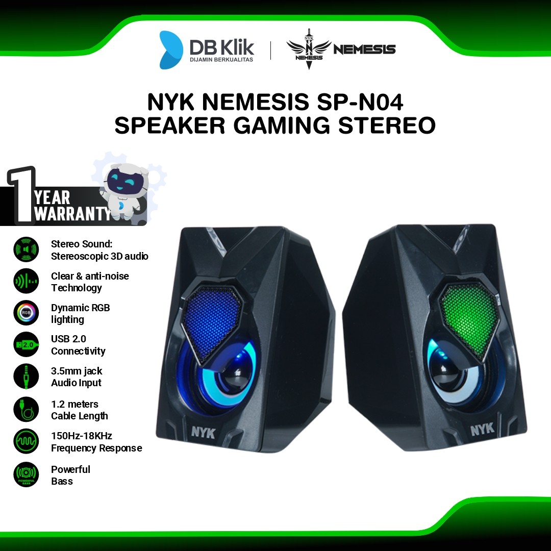 Membeli berarti setuju. Mohon untuk membaca deskripsi barang terlebih dahulu. Setelah barang diterima wajib di video unboxing. Apabila tidak ada video unboxing, maka kami tidak akan menerima komplain dalam bentuk apapun Untuk setiap pembelian unit pecah belah wajib menambahkan bubble + triplek dan asuransiApabila tidak menambahkan bubble + triplek dan asuransi maka segala kerusakan dan kehilangan bukan tanggung jawab kamiNYK Nemesis SP-N04 Speaker Gaming Stereo Wired RGB Bass Lighting Specifications :* Stereoscopic 3D Games Stereo Audio* 1,2M Cable Lenght* Clear & Anti Noise Technology* Cool RGB Lighting* Double Sides Powerfull Bass* Rated Power: 3W X 2* Impendance: 4 Ohm* Volume Control: In-Line* Driver: Super Neodymium Magnet Speaker* Driver Units: 52mm*2* Frequency Response: 150Hz-18KHz* Power Source: USB 2.0 and 3.5mm Jack Audio* Cable Length: 1.2 meterGAMING RGB SOUND BAR WITH 3D GAMES STEREO AUDIO AND DOUBLE SIDES STRONG BASS.Gaming RGB Speaker SP-N04 already equipped with RGB Lighting and Stereoscopic 3D Gaming Stereo Audio that produce clear, powerful sound that makes you more immerse in game. This speaker also have Double Sides Powerfull Bass makes more clean sound. Also this speaker have 1,2M Cable Lenght and use USB 2.0 Power Supply.DOUBLE 52MM SUPER NEODYMIUM MAGNET SPEAKER.52mm Powerful Neodymium SpeakerSpeaker NYK SP-N04 already equipped with Double Sides Powerfull Bass makes more clean sound.1 Year WarrantyNote : Selama produk tayang = ready stokBarang yang sudah di beli tidak bisa dikembalikanPastikan alamat pengiriman telah benar, kesalahan alamat bukan tanggung jawab kami Untuk pertanyaan maupun keluhan bisa langsung chat admin kami"