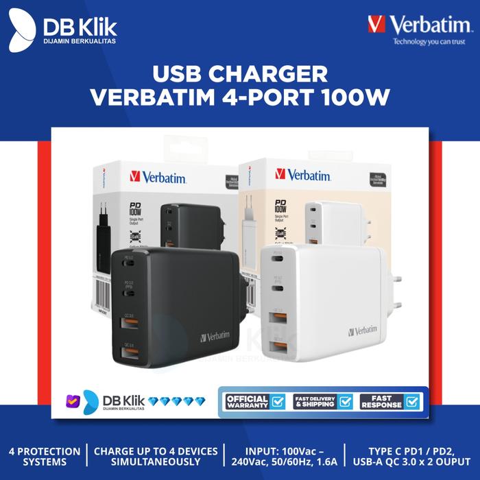 Membeli berarti setuju Mohon untuk membaca deskripsi barang terlebih dahulu. Setelah barang diterima Wajib di video unboxing Apabila tidak ada video unboxing, kami Tidak menerima komplain dalam bentuk apapun USB Charger Verbatim 4-port 100W with PD 3.0 & QC 3.0 GaN Newest GaN technology, smaller size with higher power Equipped with 2 Type C PD ports and 2 USB-A QC 3.0 ports Type C PD1 and PD2 port supports up to 100W charging when being used alone USB-A1 and USB-A2 port supports up to 18W charging when being used alone Charge up to 4 devices simultaneously With 4 Protection Systems to ensure safety Specifications: Input: 100Vac 240Vac, 50/60Hz, 1.6A Output: Type C PD1 / PD2 Each 5Vdc/3A, 9Vdc/3A, 12Vdc/3A, 15Vdc/3A, 20Vdc/5A (Max. 100W) (PD2 PPS mode : 3.3 21 Vdc/5A) USB-A QC 3.0 x 2 Each 5Vdc/3A, 9Vdc/2A, 12Vdc/1.5A (Max. 18W) Total output : Max. 100W Over current protection, Over voltage protection, Short circuit protection, Over temperature protection Operating temperature : 0oC 40 oC Storage temperature : -25 oC 65 oC Product dimensions : 107.5 x 48.4 x 60 (mm) Product weight : 210g Material : Flame resistant PC nb :*SELAMA PRODUK TAYANG = READY STOK *UNTUK BARANG PECAH BELAH DISARANKAN UNTUK MENGGUNAKAN TAMBAHAN BUBBLE WRAP / TRIPLEK *BUBBLE WRAP SUDAH TERSEDIA DI ETALASE KAMI. SILAHKAN TAMBAHKAN KE DALAM KERANJANG ANDA *PASTIKAN ALAMAT PENGIRIMAN TELAH BENAR. KESALAHAN ALAMAT BUKAN TANGGUNG JAWAB KAMI *Untuk PERTANYAAN & KELUHAN bisa langsung CHAT ADMIN KAMI *HAPPY SHOPPING